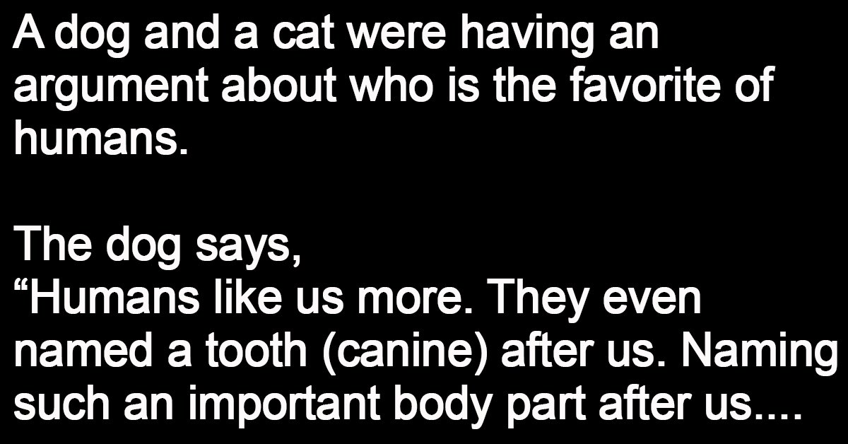 A dog and a cat were having an argument about who is the favorite of humans. The dog says, “Humans like us more. They even named a tooth (canine) … …