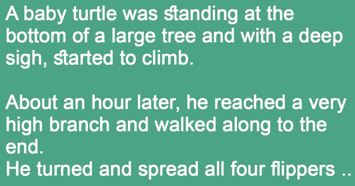 A baby turtle was standing at the bottom of a large tree and with a deep sigh, started to climb. About an hour later, he reached a very high … …