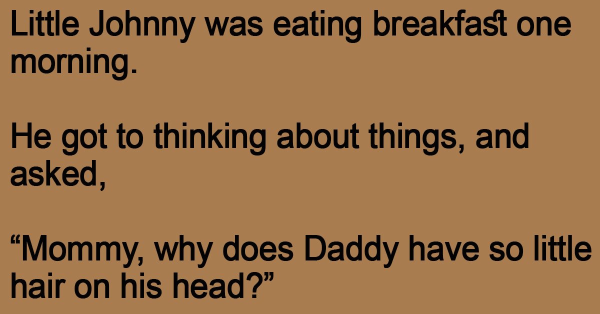 Little Johnny was eating breakfast one morning. He got to thinking about things, and asked, “Mommy, why does Daddy have so little hair on his head?” “He thinks a lot, … …