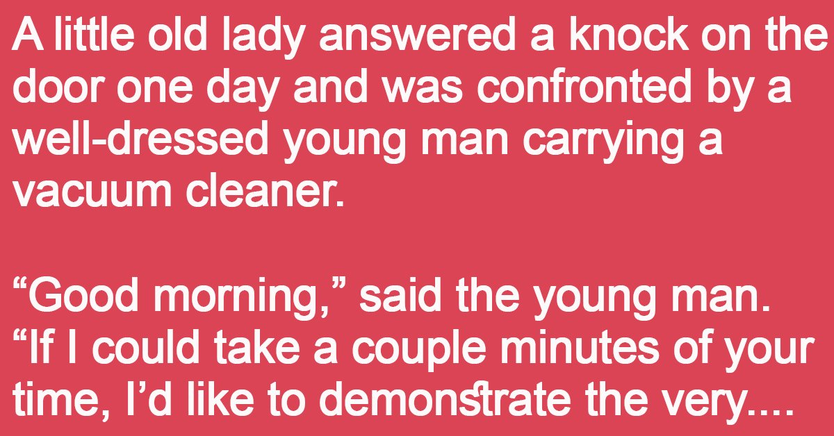 A little old lady answered a knock on the door one day and was confronted by a well-dressed young man carrying a vacuum cleaner. “Good morning,” said the young … …