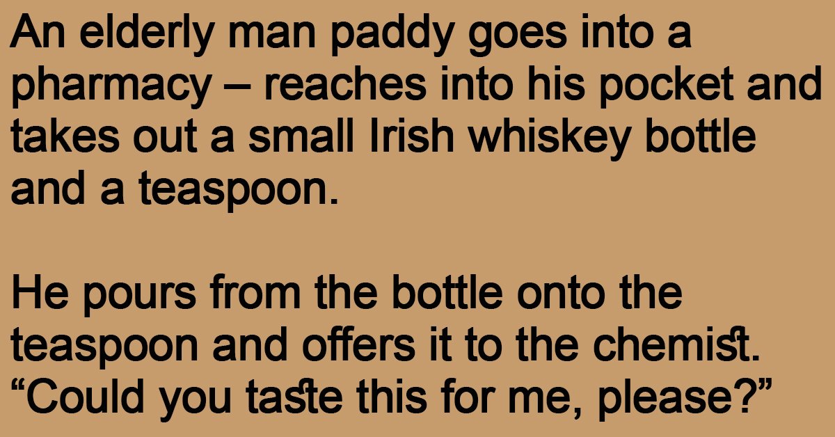 An elderly man paddy goes into a pharmacy – reaches into his pocket and takes out a small Irish whiskey bottle and a teaspoon. He pours from the bottle … …