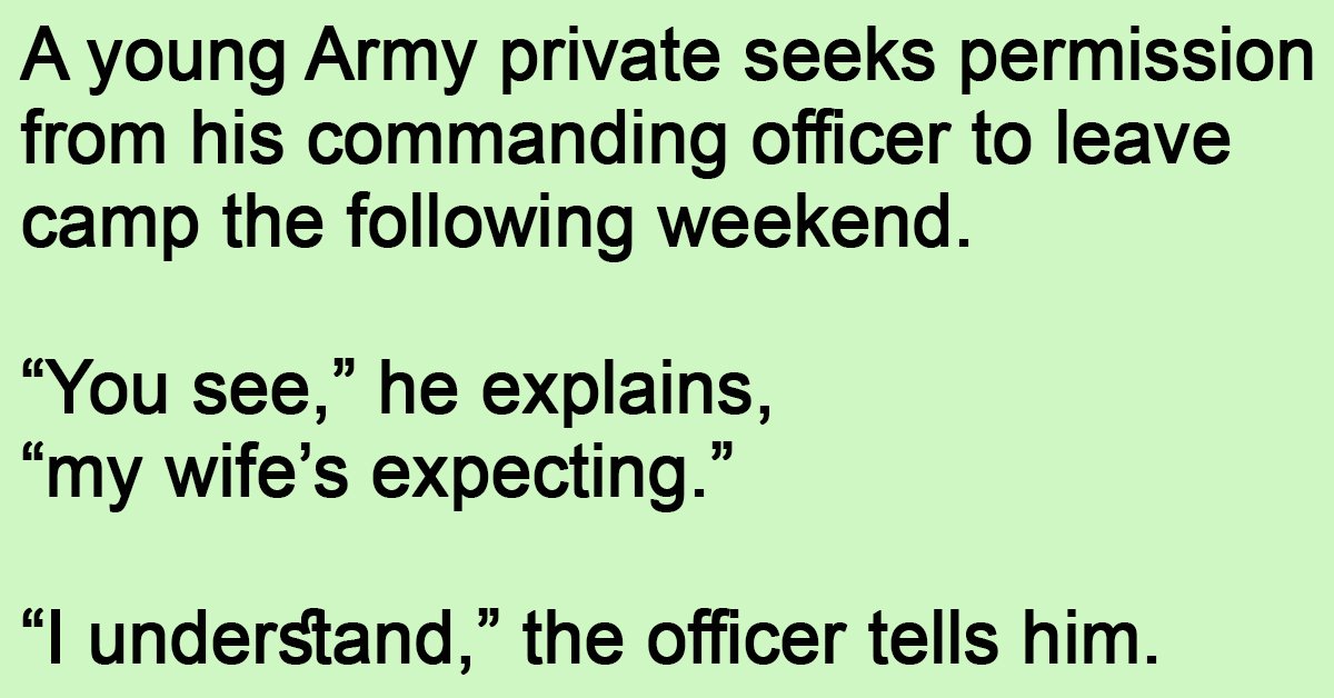 A young Army private seeks permission from his commanding officer to leave camp the following weekend. “You see,” he explains, “my wife’s expecting.” “I understand,” the officer tells him. … …