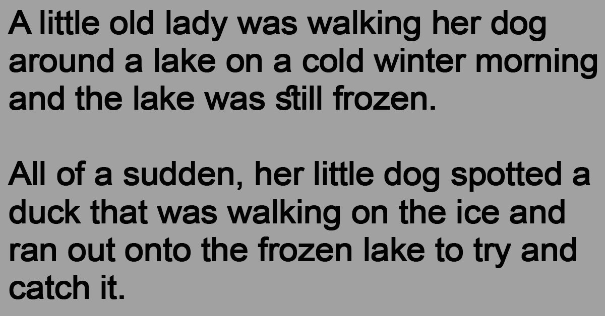 A little old lady was walking her dog around a lake on a cold winter morning and the lake was still frozen. All of a sudden, her little dog … …