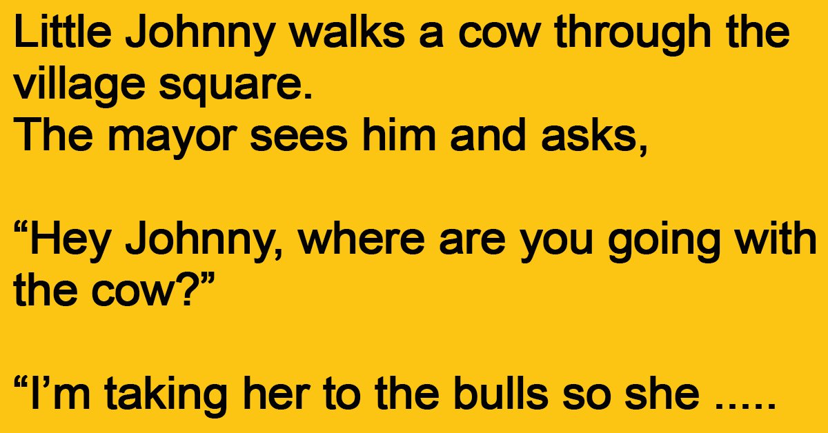 Little Johnny walks a cow through the village square. The mayor sees him and asks, “Hey Johnny, where are you going with the cow?” “I’m taking her to the … …