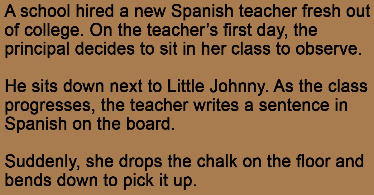 A school hired a new Spanish teacher fresh out of college. On the teacher’s first day, the principal decides to sit in her class to observe. He sits down next … …