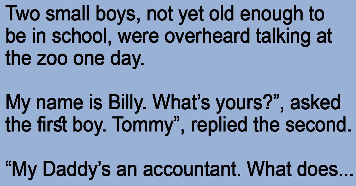 Two small boys, not yet old enough to be in school, were overheard talking at the zoo one day. My name is Billy. What’s yours?”, asked the first boy. Tommy”, replied the … …