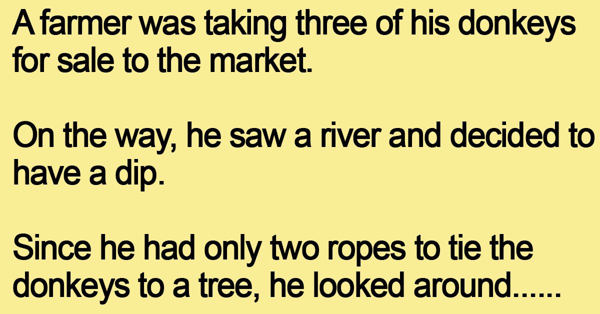 A farmer was taking three of his donkeys for sale to the market. On the way, he saw a river and decided to have a dip. Since he had only … …