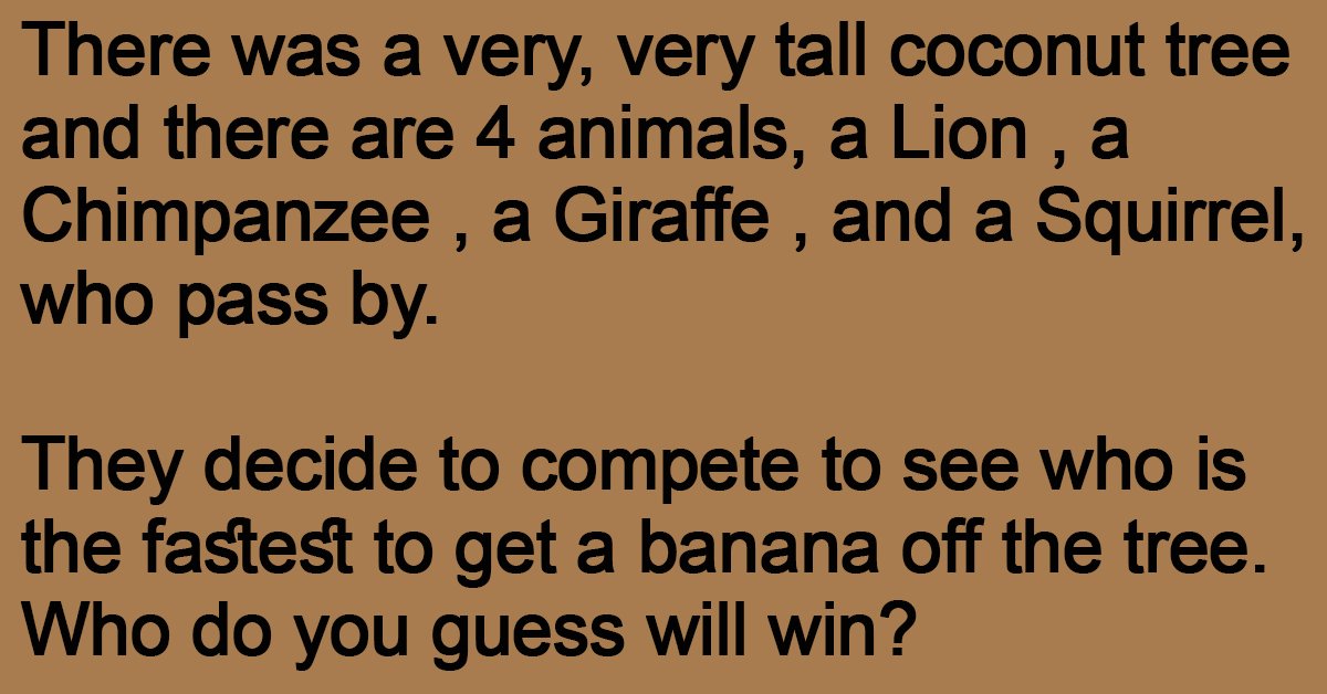 There was a very, very tall coconut tree and there are 4 animals, a Lion , a Chimpanzee , a Giraffe , and a Squirrel , who pass by. … …