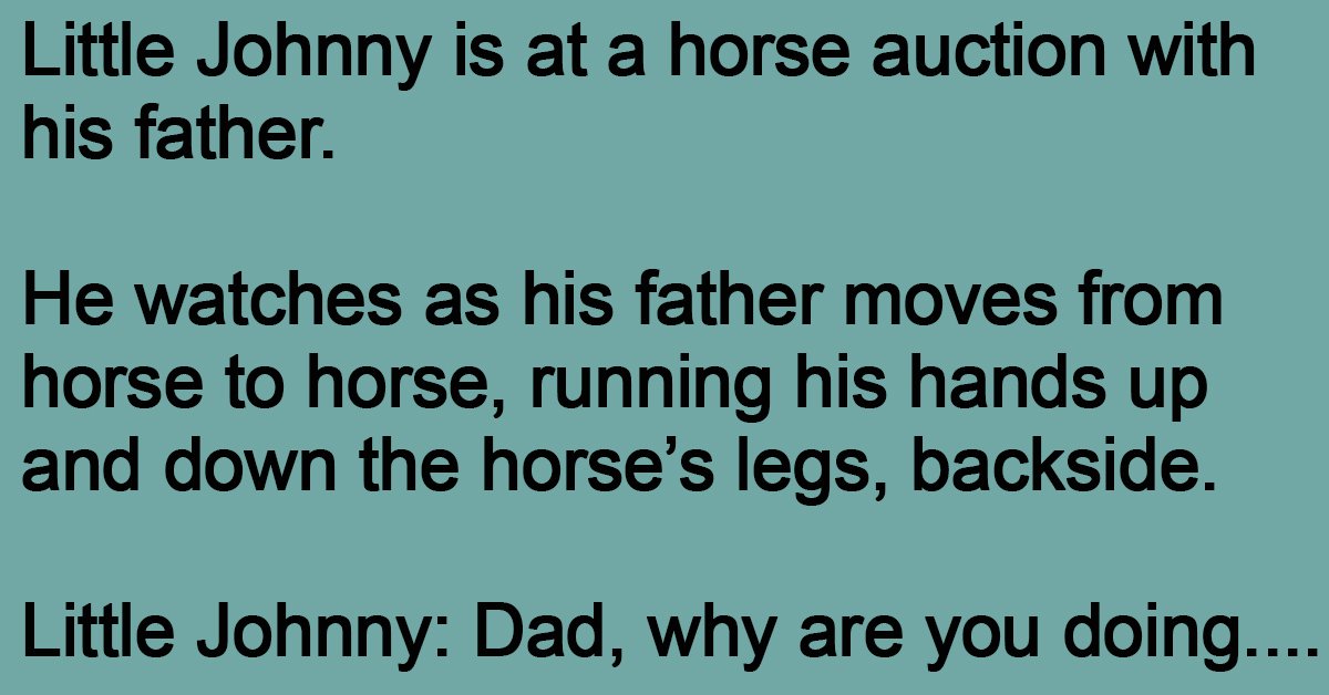 Little Johnny is at a horse auction with his father. He watches as his father moves from horse to horse, running his hands up and down the horse’s legs, … …