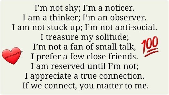 I’m not shy; I’m a noticer. I am a thinker; I’m an observer. I am not stuck up; I’m not anti-social. I treasure my solitude; I’m not a fan of … …