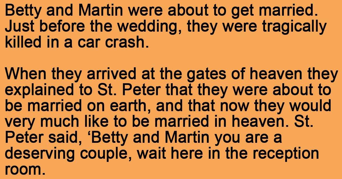 Betty and Martin were about to get married. Just before the wedding, they were tragically killed in a car crash. When they arrived at the gates of heaven they explained to St. Peter … …