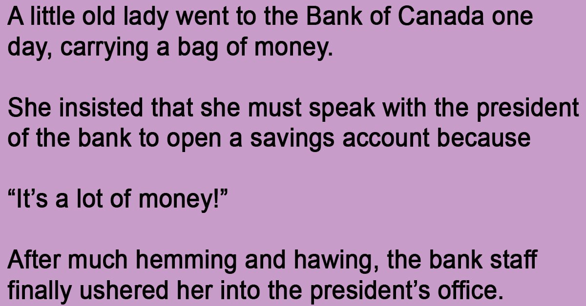 A little old lady went to the Bank of Canada one day, carrying a bag of money. She insisted that she must speak with the president of the bank to … …