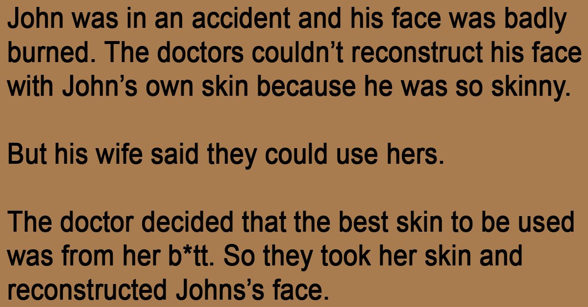 John was in an accident and his face was badly burned. The doctors couldn’t reconstruct his face with John’s own skin because he was so skinny. But his wife said they could … …