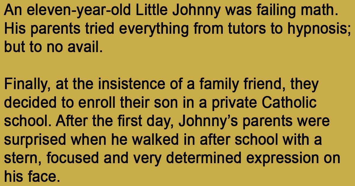 An eleven-year-old Little Johnny was failing math. His parents tried everything from tutors to hypnosis; but to no avail. Finally, at the insistence of a family friend, they decided to … …