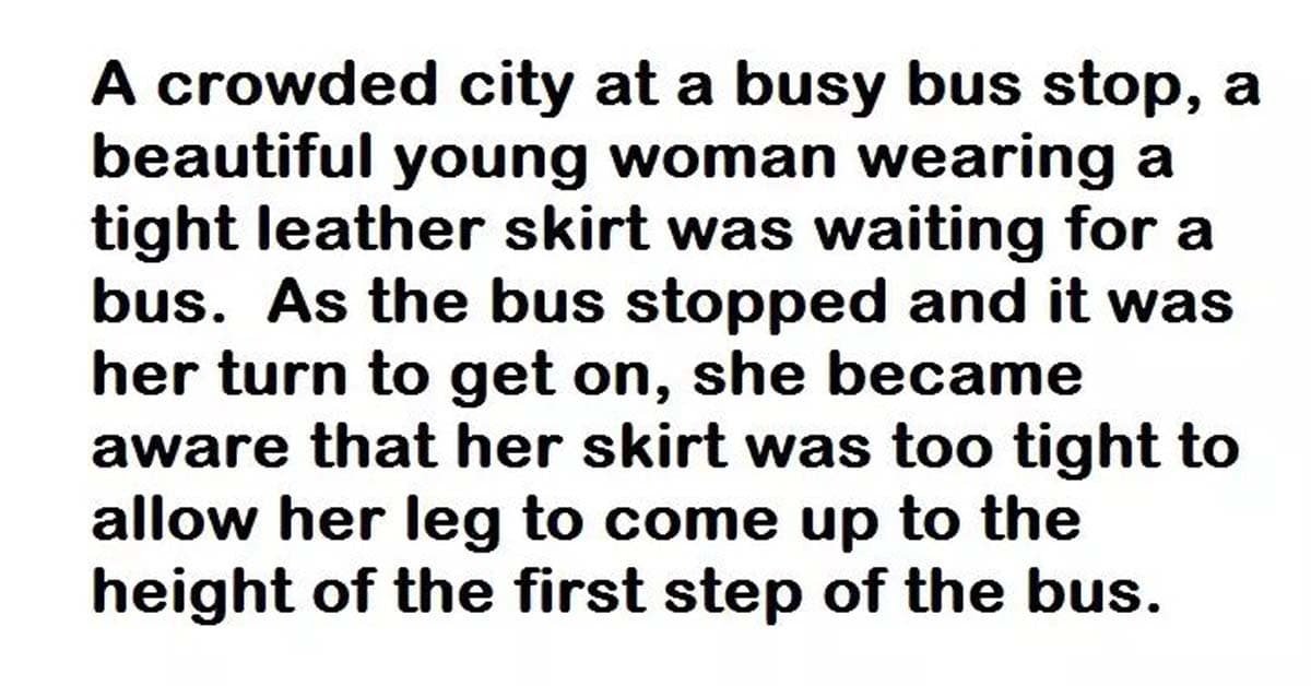 This lady that was wearing a tight skirt was waiting at the bus stop to get onto the bus. A bus pulled up and the driver opened the doors. She … …