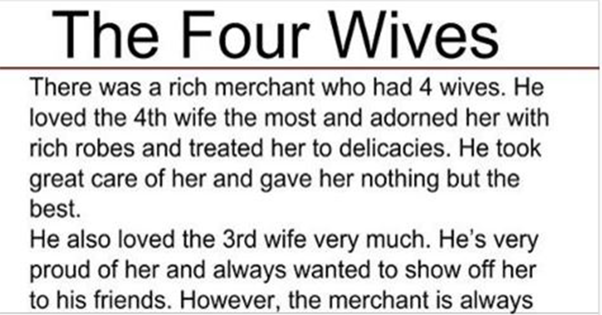 There was a rich merchant who had 4 wives. He loved the 4th wife the most and adorned her with rich robes and treated her to delicacies. He took great … …