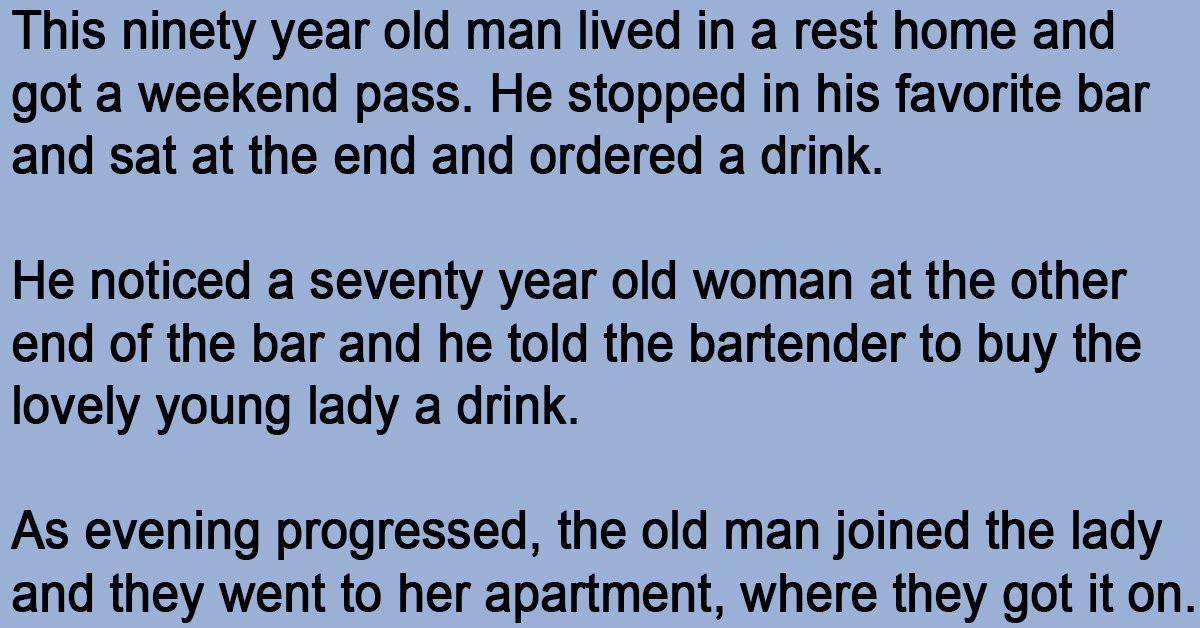 This ninety year old man lived in a rest home and got a weekend pass. He stopped in his favorite bar and sat at the end and ordered a drink. … …