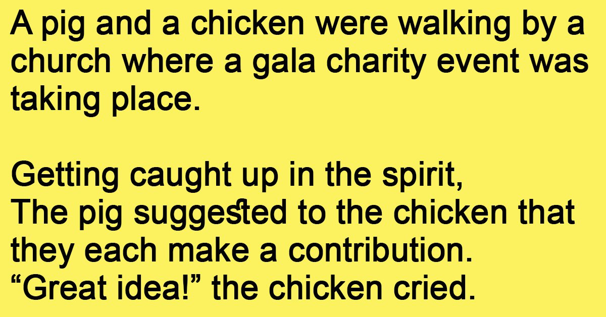 A pig and a chicken were walking by a church where a gala charity event was taking place. Getting caught up in the spirit, The pig suggested to the … …