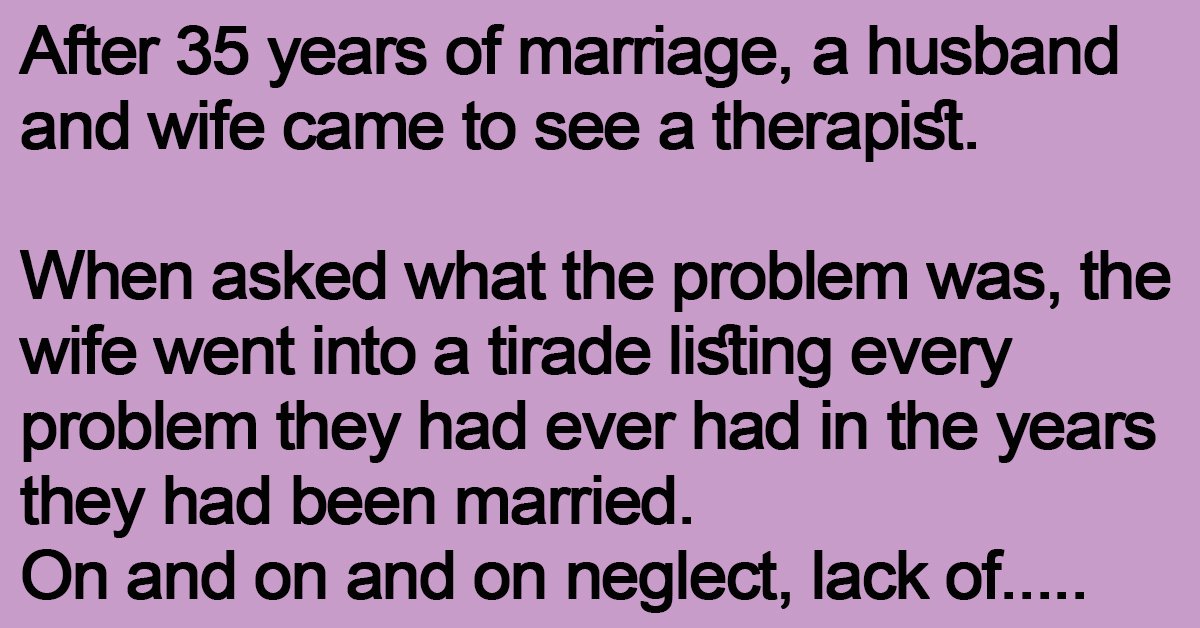 After 35 years of marriage, a husband and wife came to see a therapist. When asked what the problem was, the wife went into a tirade listing every problem … …