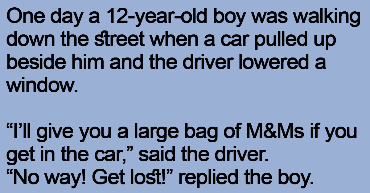 One day a 12-year-old boy was walking down the street when a car pulled up beside him and the driver lowered a window. “I’ll give you a large bag … …