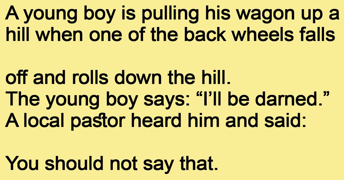 A young boy is pulling his wagon up a hill when one of the back wheels falls off and rolls down the hill. The young boy says: “I’ll be … …