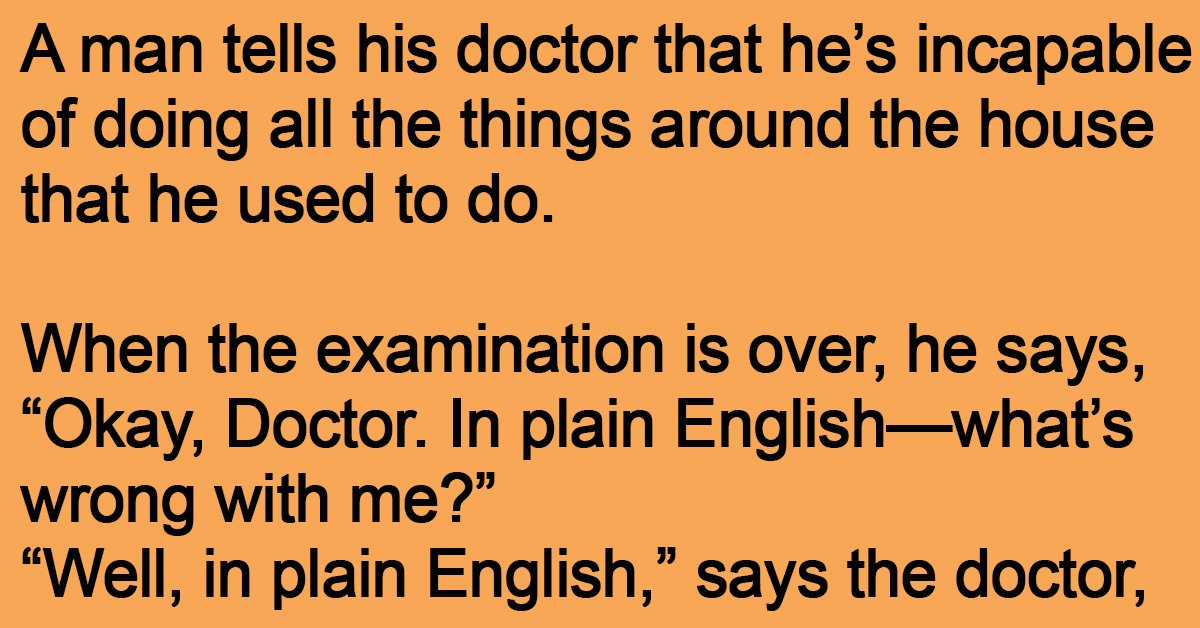 A man tells his doctor that he’s incapable of doing all the things around the house that he used to do. When the examination is over, he says, “Okay, … …