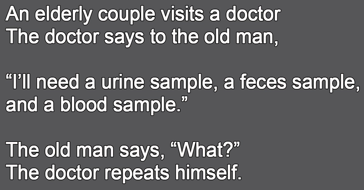 An elderly couple visits a doctor The doctor says to the old man, “I’ll need a urine sample, a feces sample, and a blood sample.” The old man says, … …