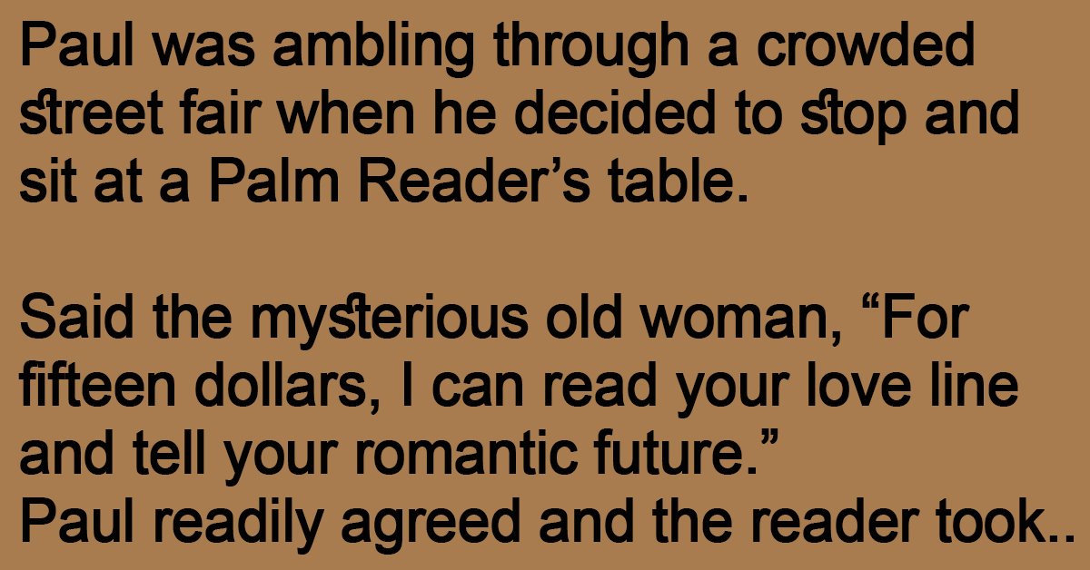 Paul was ambling through a crowded street fair when he decided to stop and sit at a Palm Reader’s table. Said the mysterious old woman, “For fifteen dollars, I … …