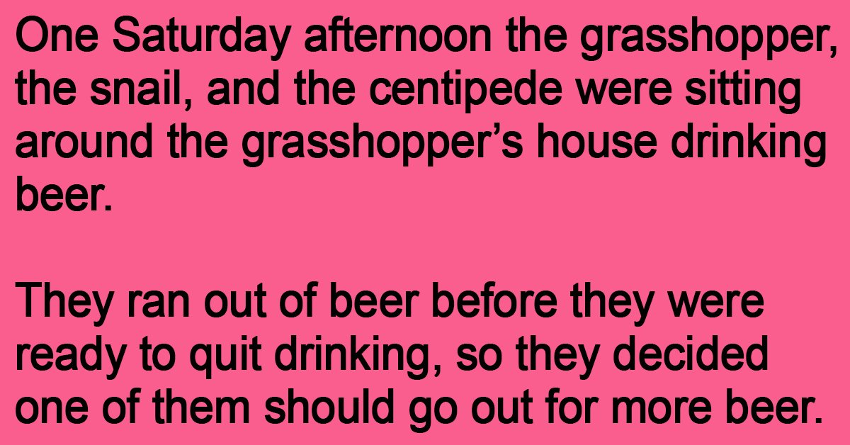 One Saturday afternoon the grasshopper, the snail, and the centipede were sitting around the grasshopper’s house drinking beer. They ran out of beer before they were ready to quit … …