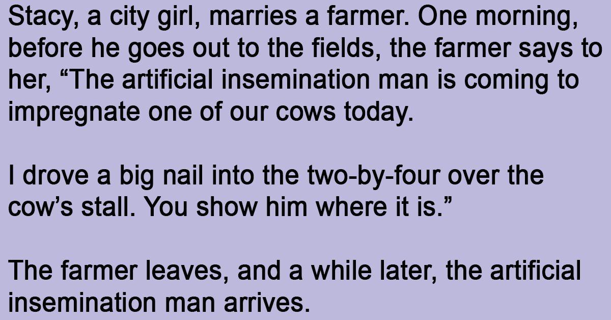Stacy, a city girl, marries a farmer. One morning, before he goes out to the fields, the farmer says to her, “The artificial insemination man is coming to impregnate one … …