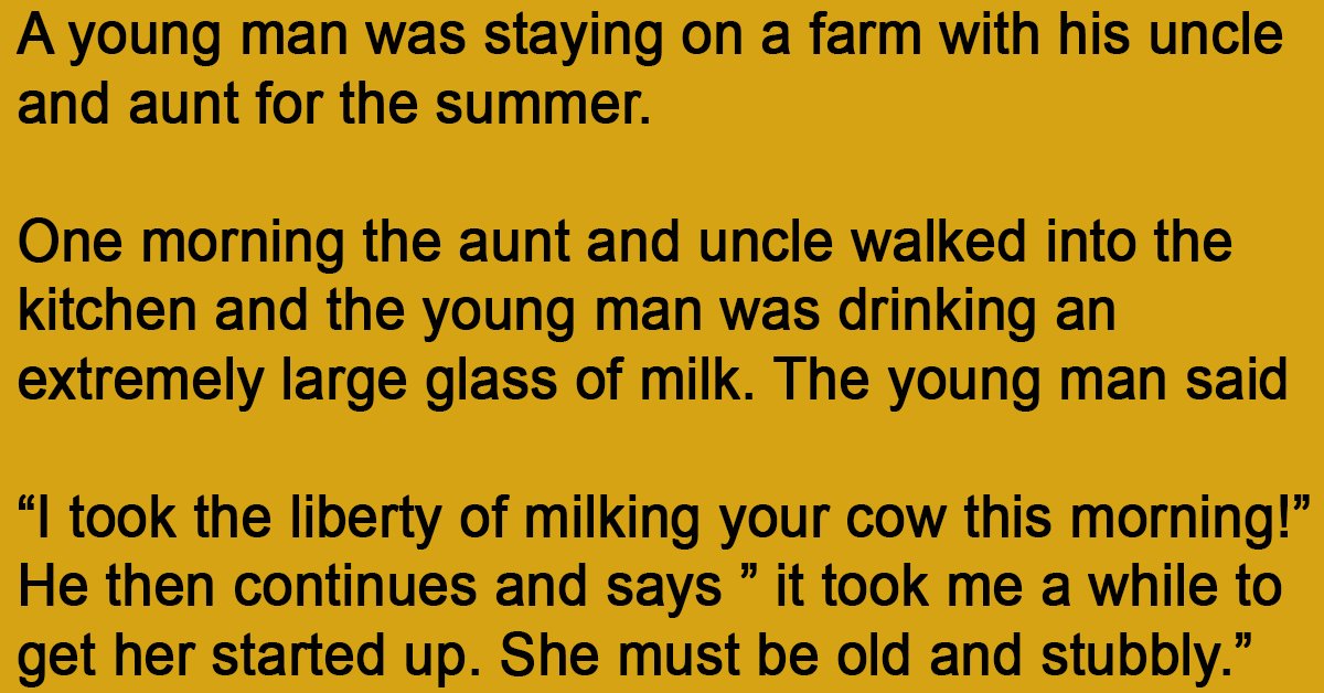 A young man was staying on a farm with his uncle and aunt for the summer. One morning the aunt and uncle walked into the kitchen and the young man … …