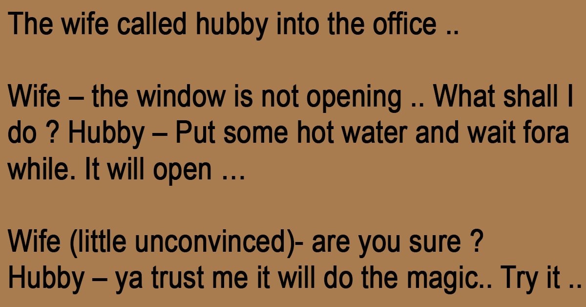 The wife called hubby into the office .. Wife – the window is not opening .. What shall I do ? Hubby – Put some hot water and wait fora … …
