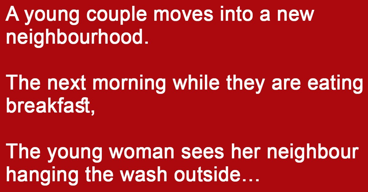 A young couple moves into a new neighbourhood. The next morning while they are eating breakfast, The young woman sees her neighbour hanging the wash outside… “That laundry is … …