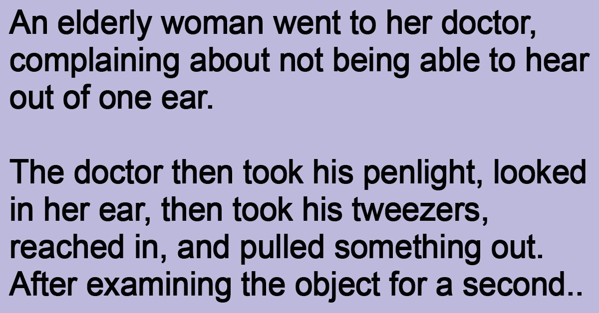 An elderly woman went to her doctor, complaining about not being able to hear out of one ear. The doctor then took his penlight, looked in her ear, then … …