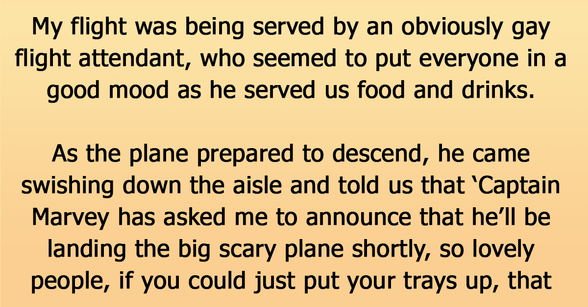 My flight was being served by an obviously gay flight attendant, who seemed to put everyone in a good mood as he served us food and drinks.