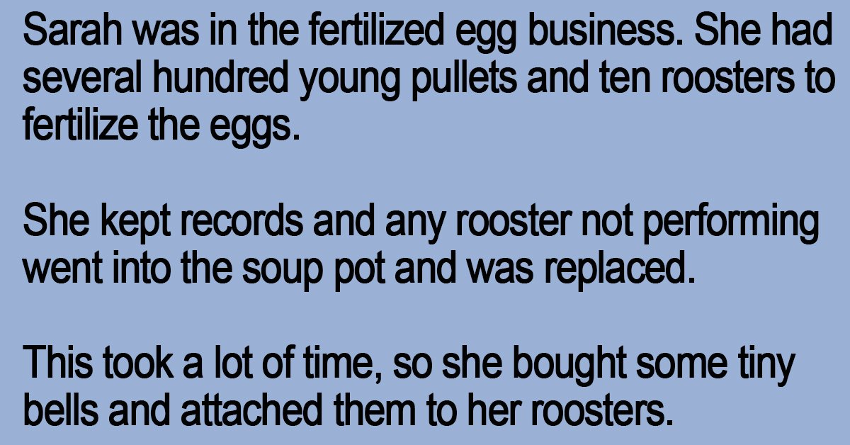 Each bell had a different tone, so she could tell from a distance which rooster was performing.