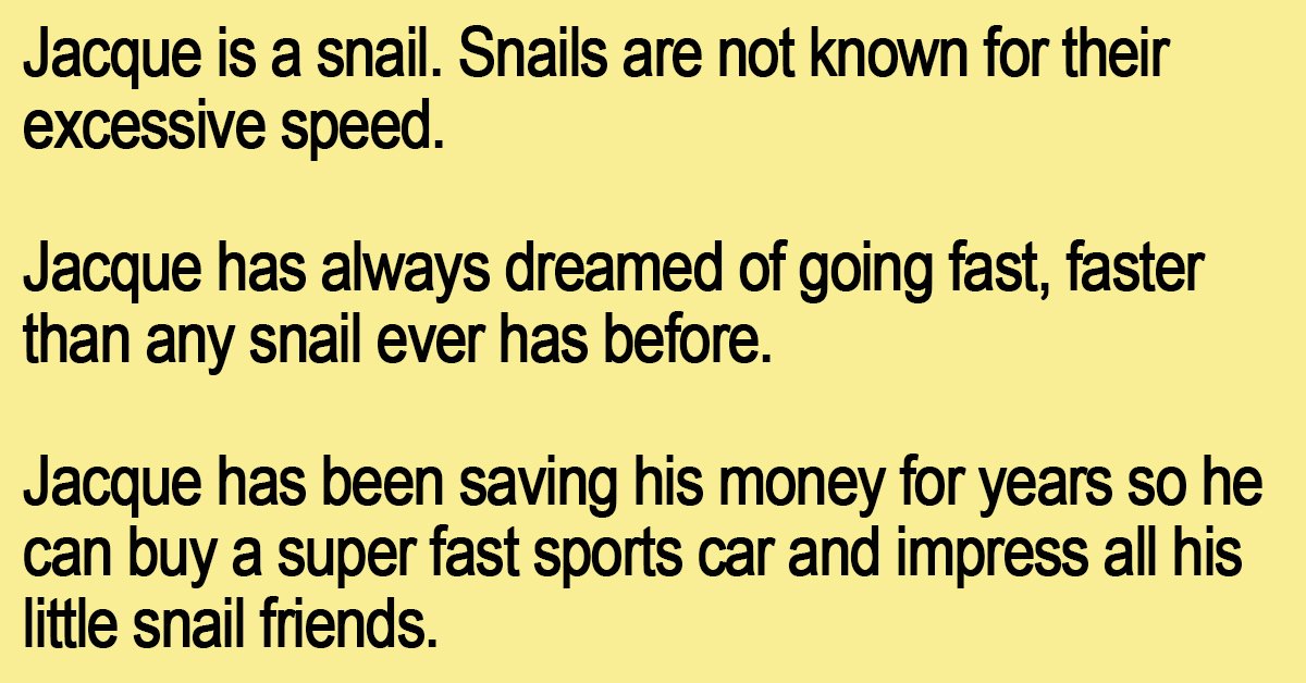 Jacque has always dreamed of going fast, faster than any snail ever has before.