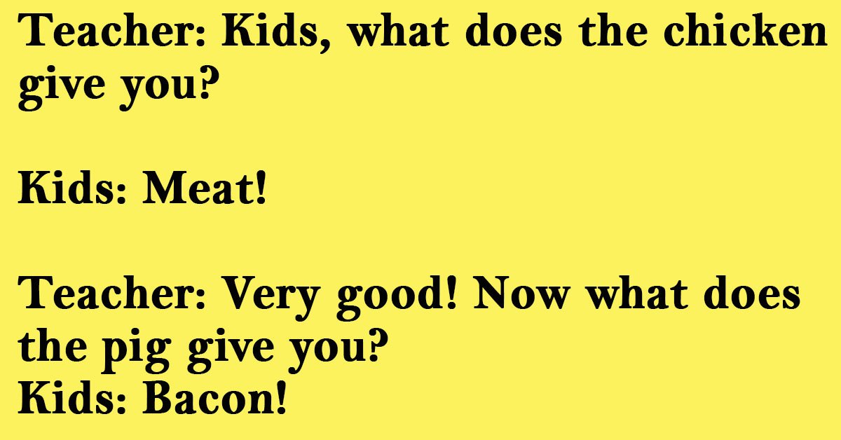 Teacher Asked A Question To Kid. April 6, 2023 by Kevin Adams Facebook Twitter Pinterest LinkedInTeacher: Kids, what does the chicken give you? Kids: Meat! Teacher: Very good! Now what does the pig give you? Kids: Bacon! Teacher: Great! And what does the fat cow give you? Kid: Homework! Facebook Twitter Pinterest LinkedIn