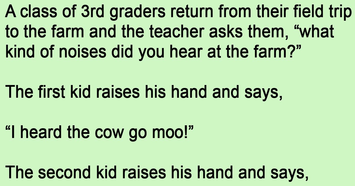 A class of 3rd graders return from their field trip to the farm and the teacher asks them, “what kind of noises did you hear at the farm?”