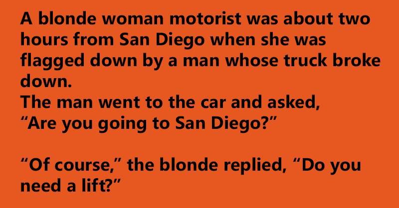 A blonde woman motorist was about two hours from San Diego when she was flagged down by a man whose truck broke down.