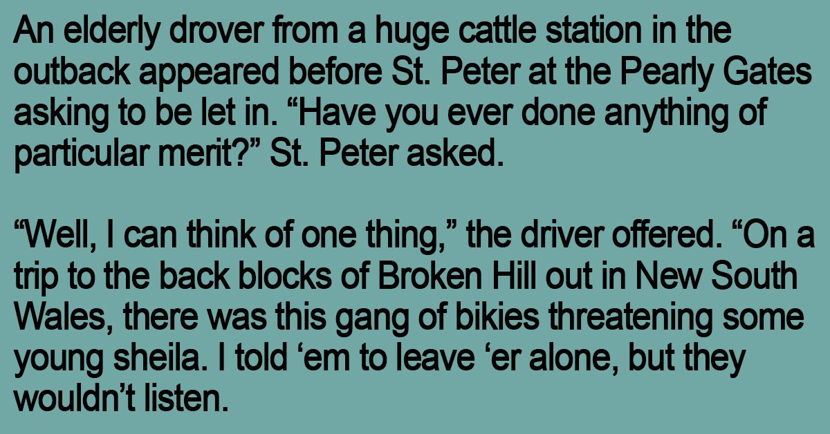 An elderly drover from a huge cattle station in the outback appeared before St. Peter at the Pearly Gates asking to be let in.