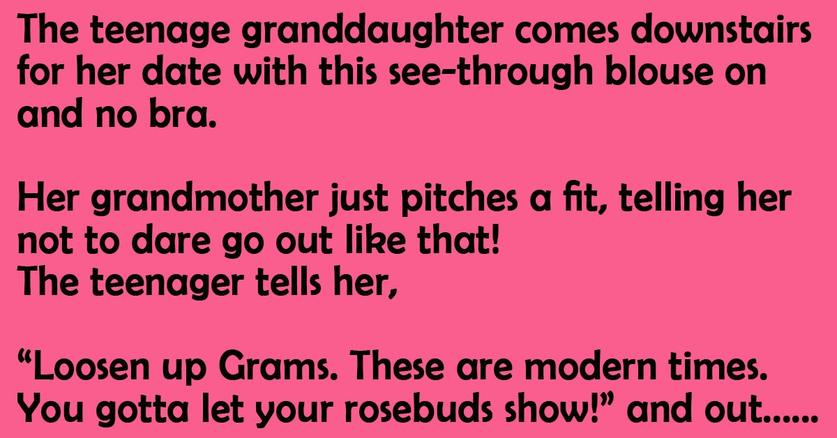 “Loosen up Grams. These are modern times. You gotta let your rosebuds show!” and out she goes.