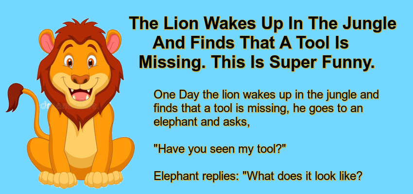 The Lion Wakes Up In The Jungle And Finds That A Tool Is Missing. – June 3, 2022 by Kevin Adams Facebook Twitter Pinterest LinkedIn One Day the lion wakes up in the jungle and finds that a tool is missing, he goes to an elephant and asks, “Have you seen my tool?” Elephant replies: “What does it look like?” Lion: “Well it’s got four points on it.” Elephant: “Sorry, I haven’t seen it, try mouse.” So the Lion goes to the mouse and asks “Have you seen my tool?” Mouse: “What does it look like?” Lion: “Well it’s got four points on it.” Mouse: “Sorry mate, I’ve not seen it, try croc.” So the lion proceeds to the crocodile and asks “Have you seen my tool?” Croc: “What does it look like?” Lion: “Well it’s got four points on it.” Croc: “Sorry I’ve not seen it, try Jaguar.” So the lion goes to Jaguar and asks “Have you seen my tool?” Jaguar: “Of course, I ate it.” Lion: “Why did you do that?” Jaguar: “Well I’m a four point tool eater Jaguar.” Facebook Twitter Pinterest LinkedIn