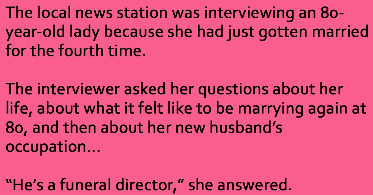 The local news station was interviewing an 80-year-old lady because she had just gotten married for the fourth time.