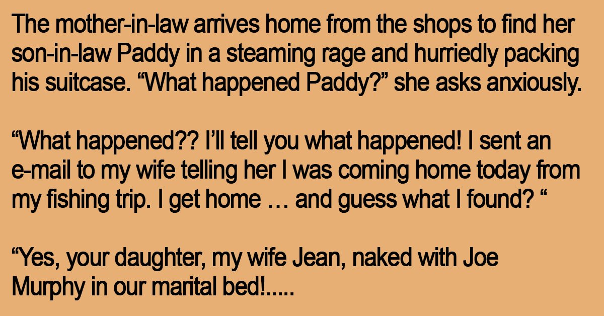 The mother-in-law arrives home from the shops to find her son-in-law Paddy in a steaming rage and hurriedly packing his suitcase.