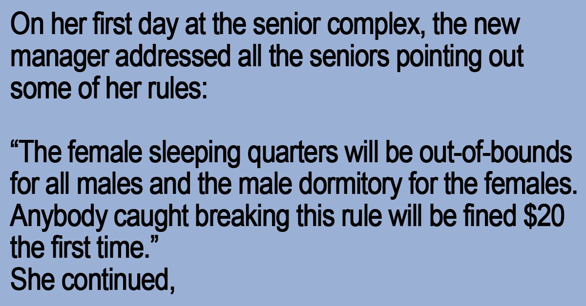 “The female sleeping quarters will be out-of-bounds for all males and the male dormitory for the females. Anybody caught breaking this rule will be fined $20 the first time.”