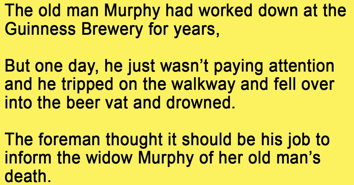 “I’m sorry to tell you, but poor old Murphy passed away at work today when he fell into the Guinness vat and drowned. “