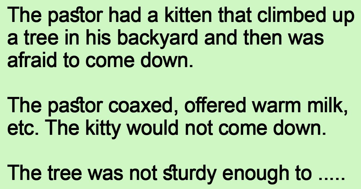 The pastor had a kitten that climbed up a tree in his backyard and then was afraid to come down.