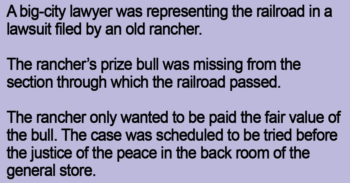 A big-city lawyer was representing the railroad in a lawsuit filed by an old rancher.
