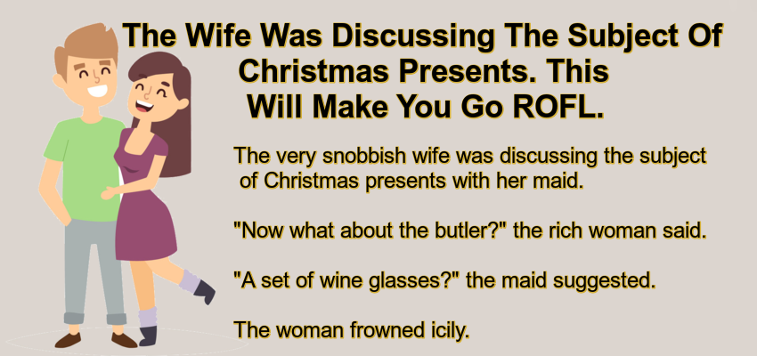 The Wife Was Discussing The Subject Of Christmas Presents. – May 12, 2022 by Kevin Adams Facebook Twitter Pinterest LinkedIn The very snobbish wife was discussing the subject of Christmas presents with her maid. “Now what about the butler?” the rich woman said. “A set of wine glasses?” the maid suggested. The woman frowned icily. “He doesn’t really need that. A butler never entertains. He’ll get a tie.” The maid grimaced, but said only, “What about a dress for Jenny, the serving girl?” The woman frowned again. “She doesn’t really need a new dress. She’ll only get in trouble. We’ll get her another apron.” The conversation continued in the same vein, and the maid was chafing At her employer’s arrogance when they reached her husband. “I assume you want to get him something he really needs, madam?” the maid replied. “Of course,” the woman replied. “Then what about three more inches?”, said the maid. Facebook Twitter Pinterest LinkedIn